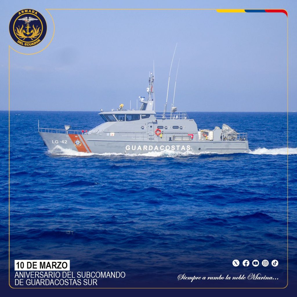 La Armada del Ecuador saluda en su aniversario al Subcomando de Guardacostas Sur, brazo ejecutor del Comando de Guardacostas (COGUAR); actualmente se encuentra ejecutando las operaciones y el control de los espacios #Marítimos jurisdiccionales en la #FronteraSur del país. Felicidades al Subcomando de Guardacostas Sur en su día clásico.