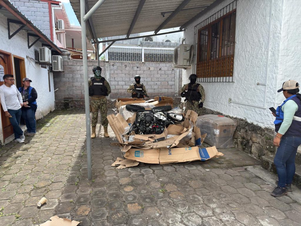 Personal de la Armada del Ecuador, en coordinación con otras instituciones del Estado ejecutaron operaciones de control y vigilancia en puertos; y realizaron una intervención en un Puerto de la localidad de Santa Cruz donde se detectó que 01 contenedor con manifiesto de carga para materiales de limpieza, tenía presunto contrabando de mercadería, aproximadamente 04 motos y 10 bultos de piezas vehiculares, dando un peso de 01 Tonelada.