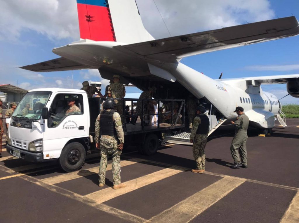 Personal de la FT. 41 «Insular» desembarcó los paquetes electorales, biombos, urnas y los kits técnicos que arribaron vía aérea, a través de la @fuerzaaereaec desde Latacunga hasta San Cristóbal, posteriormente fueron trasladados de forma segura hasta la bodega de la Dirección Provincial de San Cristóbal, donde fueron entregados con las respectivas actas de constatación a los miembros del CNE provincial.