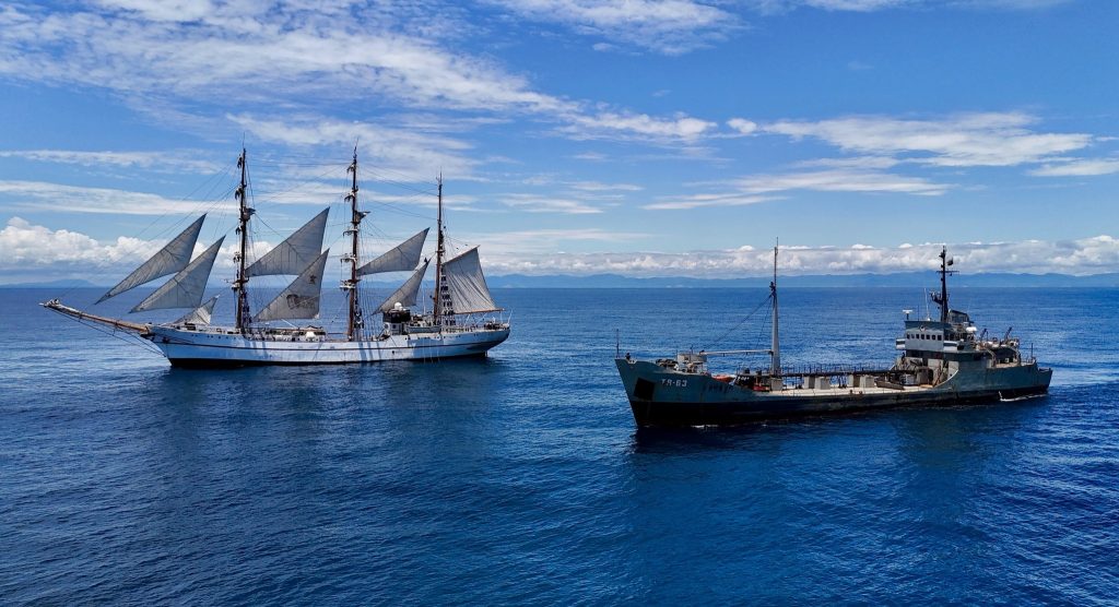 El Buque Escuela Guayas y BAE Atahualpa, se encuentran en el mar, mientras cumplen operaciones de control marítimo e instrucción de guardiamarinas y apoyo logístico de agua potable a Esmeraldas, respectivamente. Entre sus dotaciones, se cumple el saludo tradicional en el mar. Los guardiamarinas de la Escuela Superior Naval realizan honores por alto!