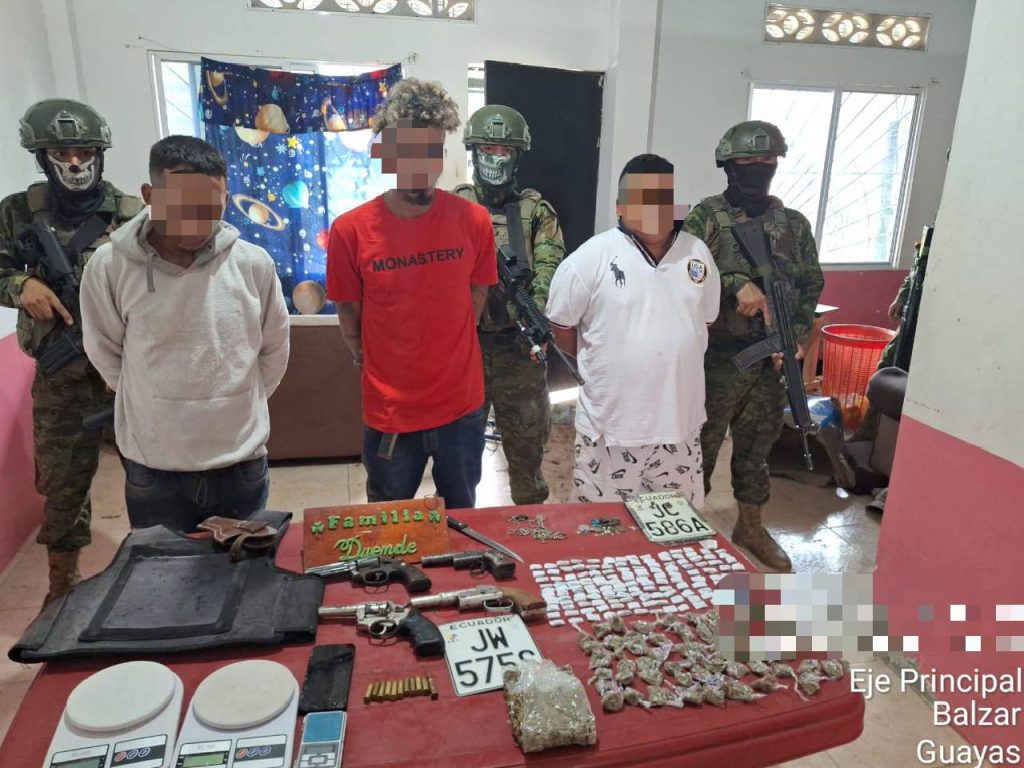 Efectivos del Ejército Ecuatoriano durante operaciones de control de armas municiones y explosivos ejecutadas en el sector #NuevoPorvenir, decomisaron varias clases de armas, entre las que se encontraban: revólveres calibre .38mm, pistolas de fabricación artesanal, municiones calibre .38mm, chaleco antibalas, varias dosis de SCSF, balanzas, terminal móvil y arma blanca. En la operación se aprehendió a tres ciudadanos, quienes junto a las evidencias fueron puestos a órdenes de las autoridades competentes.