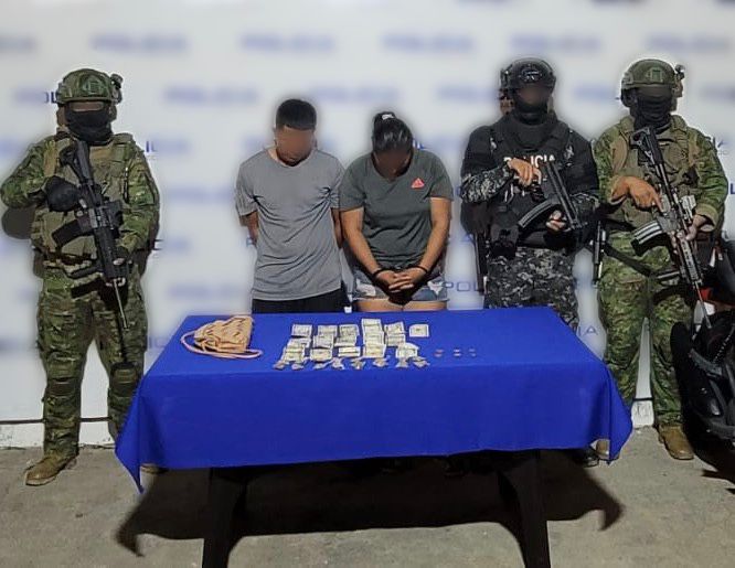 Personal del Ejército, mientras realizaba operaciones militares de control de armas municiones y explosivos, en el cantón Machala, avenida Octava Norte, registró a una pareja que se transportaban en una moto junto a una menor, encontrando en la cartera de la ciudadana envolturas plásticas con sustancias catalogadas sujetas a fiscalización y dinero en efectivo, por lo que los adultos fueron aprehendidos. Las evidencias y los aprehendidos fueron puestos a órdenes de las autoridades competentes para los trámites legales correspondientes.