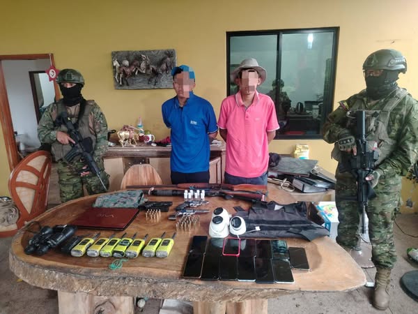 Efectivos del Ejército Ecuatoriano realizaron allanamientos en varios domicilios, logrando el decomiso de armamento y municiones y la aprehensión de dos personas. Durante la intervención, se incautaron: pistola, revólveres y carabinas, municiones de diferentes calibres, chaleco antibalas, radios Motorolas, terminales móviles y cámaras de vigilancia. Como resultado de esta operación militar fueron aprehendidos Luis B. S. y Gary B. C., quienes, junto con el material decomisado, fueron entregados a las autoridades competentes.