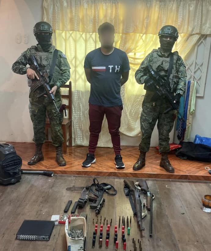 Personal militar del Grupo de Fuerzas Especiales N.º 26 Cenepa con información de inteligencia militar, en el km 7 vía Buena Fé, identificaron una vivienda, la cual, al realizar el registro se aprehendió a un ciudadano y se decomisaron: armas de fuego, municiones de diferentes calibres y alimentadores de sub ametralladora. Los soldados continúan neutralizando el accionar de personas que intentan desestabilizar la paz ciudadana. Las evidencias y el aprehendido se entregó a las autoridades competentes, para el procedimiento de ley correspondiente.