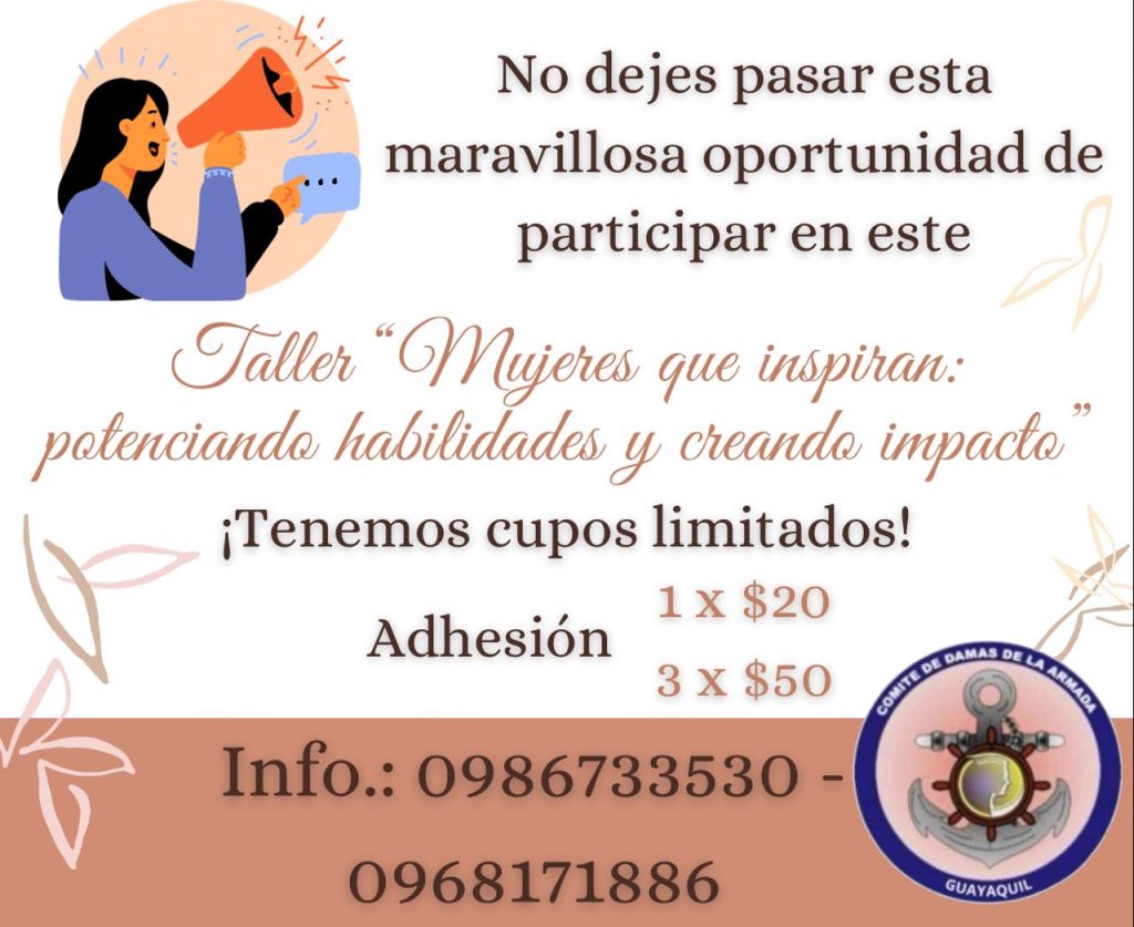 La Sra. Anabel Vaca de Unda, Presidenta del Comité de Damas de la Armada, Subsede Guayaquil, se complace en invitar a las esposas de oficiales  de la Armada a participar en el taller: “Mujeres que inspiran: potenciando habilidades y creando impacto”, siendo la ocasión para conocer herramientas que  ayuden a fortalecer el desarrollo personal y la valiosa labor que desempeña la esposa naval en la familia.