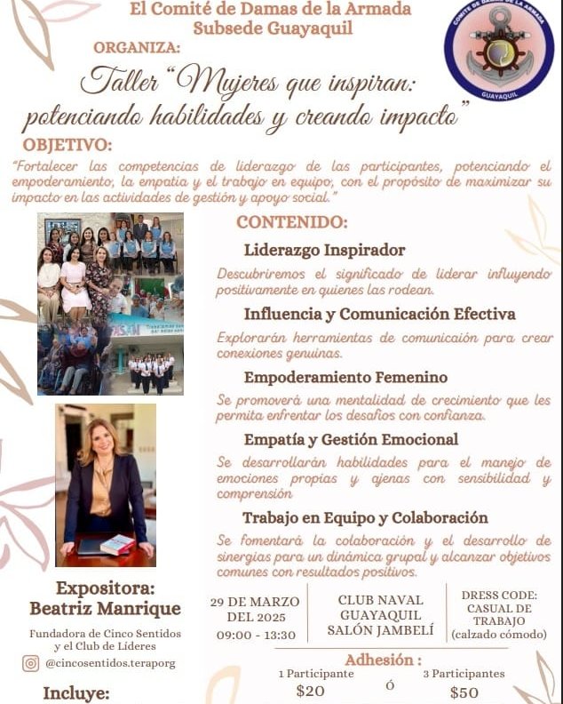La Sra. Anabel Vaca de Unda, Presidenta del Comité de Damas de la Armada, Subsede Guayaquil, se complace en invitar a las esposas de oficiales de la Armada a participar en el taller: “Mujeres que inspiran: potenciando habilidades y creando impacto”, siendo la ocasión para conocer herramientas que ayuden a fortalecer el desarrollo personal y la valiosa labor que desempeña la esposa naval en la familia.